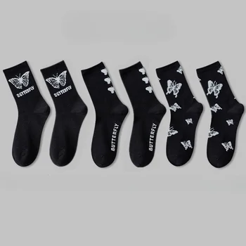 3 Pares Novas Mulheres Kawaii Algodão Borboleta Meias Senhora Feminina Preto Branco Harajuku Médio Tubo Dos Desenhos Animados Meias Para As Mulheres